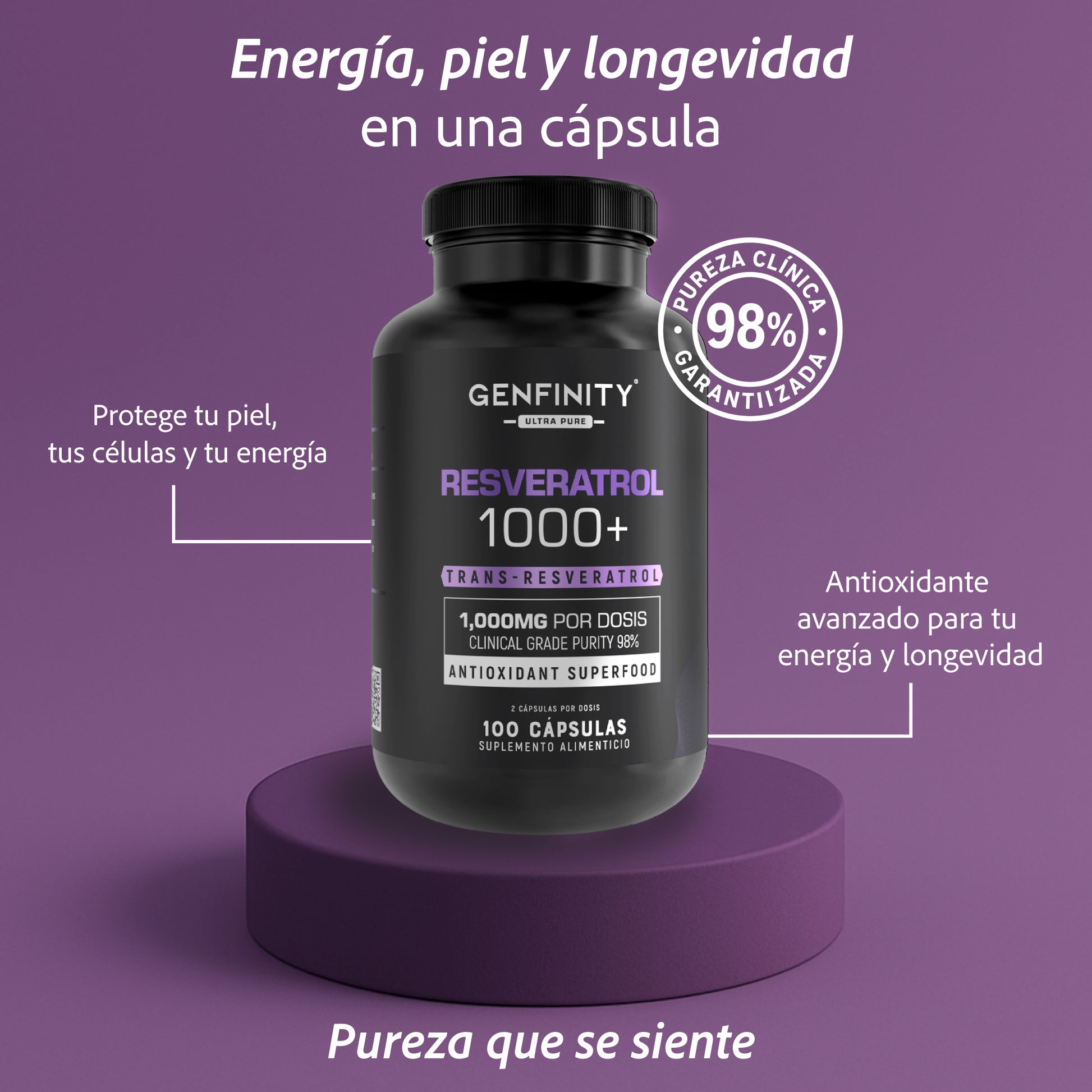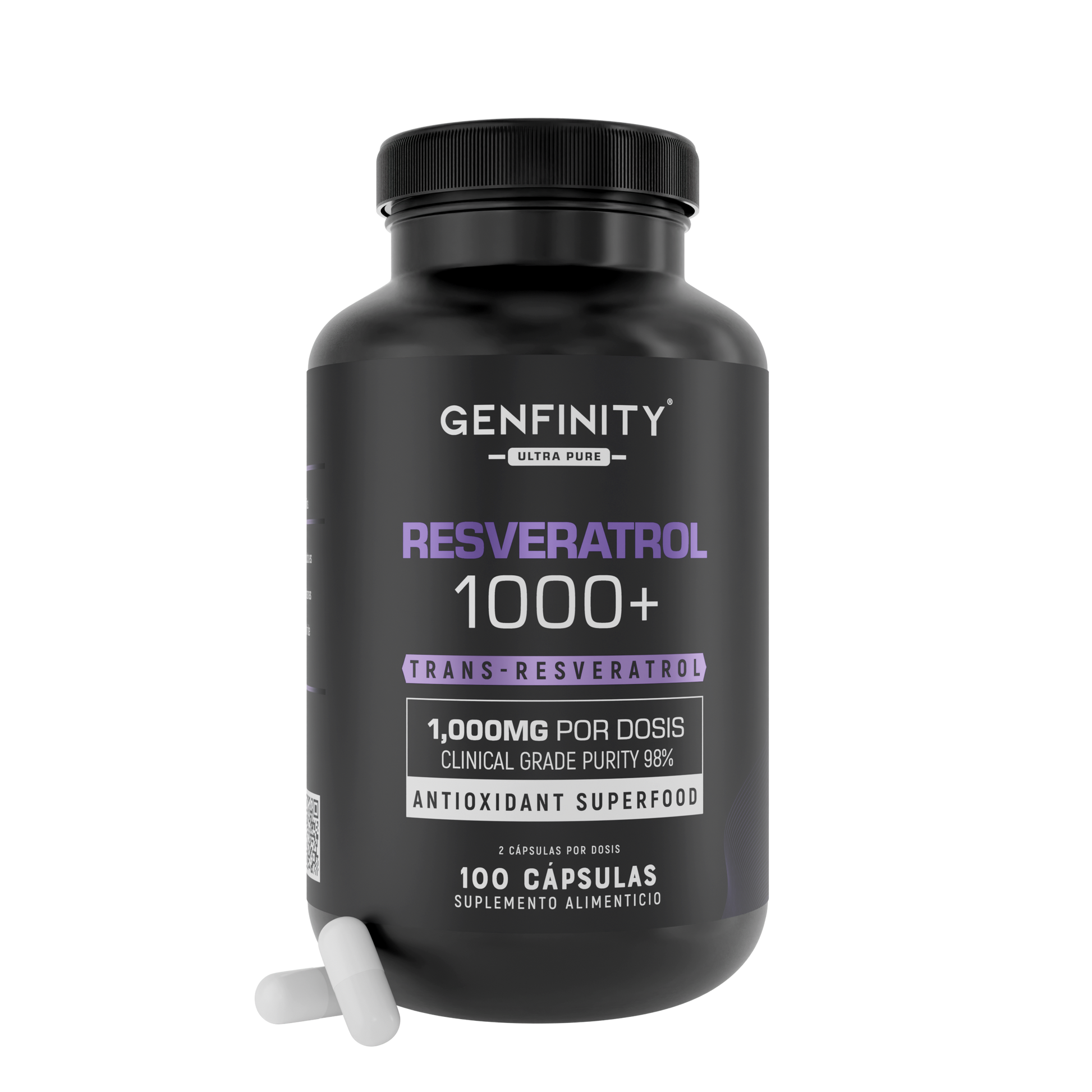 Descubre GENFINITY Resveratrol 1000+, la fórmula avanzada creada para quienes buscan vivir más y mejor. Cada cápsula concentra Resveratrol de pureza clínica al 98%, un potente antioxidante natural que protege las células del envejecimiento prematuro y promueve una vitalidad sostenida desde el interior.